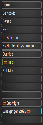 Het hele menu is in CSS gedefinieerd. Ook de statussen zijn afhankelijk van wat u doet en word door de CSS bepaalt wat de kleur van de knop wordt. De knoppen met de witte tekst zijn er altijd en in elke menu. De donkere knoppen worden gevuld afhankelijk welke keuze u gemaakt heeft. U ziet 2 voorbeeld knoppen in het plaatje links. De extra knoppen onderin het menu hebben ook een andere rand kleur tekst. Deze kunnen verschillend zijn afhankelijk van uw keuze, er kunnen maximaal 6 extra knoppen gebruikt worden. Oranje : Als u met uw muis er overheen dan maakt de CSS hem oranjel, hover heet dat. Groen : is de status Active, de keuze die u gemaakt heeft. Het grote zwarte vlak naast het menu is een z.g.n. IFRAME, dat is een kader wat ook in CSS is gedefinieerd en veranderd van inhoud als u een keuze maakt. Hierin worden de Coincards en de foto's getoond. De achtergrond is een image, die door CSS in de tabel verwerkt word. Zie plaatje rechts hiernaast. |